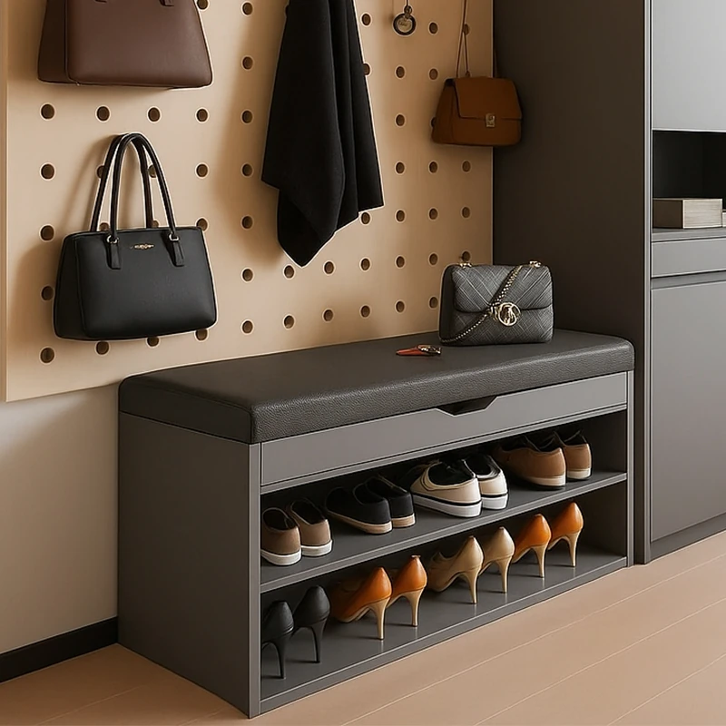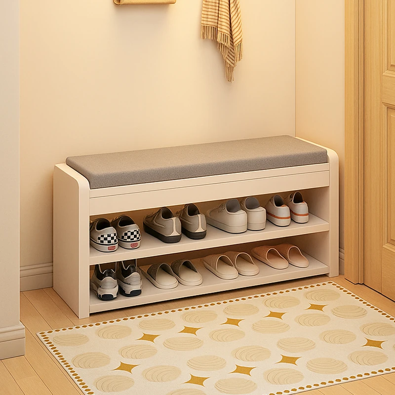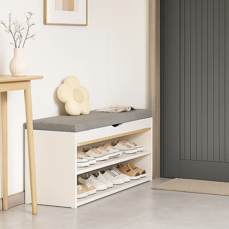玄関用シューズベンチ - おしゃれなスツール一体型シューズラック!お客様を迎えるエレガントな空間を演出し、快適に靴を履ける便利なアイテムです。軽やかでスタイリッシュなデザインで、お家の入り口を華やかに彩ります。