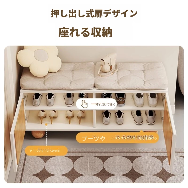 クリーミー風のスニーカー用ベンチ!玄関にぴったりな収納付きシューズキャビネット。おしゃれでコンパクト、靴を履く時の快適なサポートも実現!使いやすさとデザイン性を兼ね備えたロングタイプのシューズベンチ。