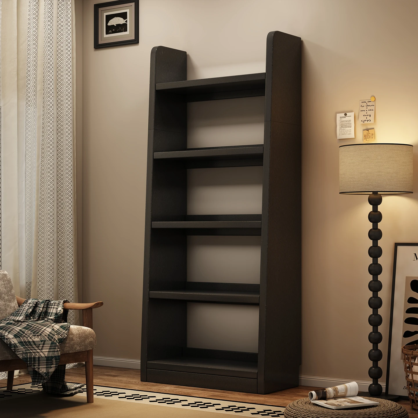 Stylish Black Trapezoidal Bookshelf and Storage Cabinet - Wall-Mounted Living Room Display Shelf and Floor Storage Rack for Elegant Organization and Chic Décor