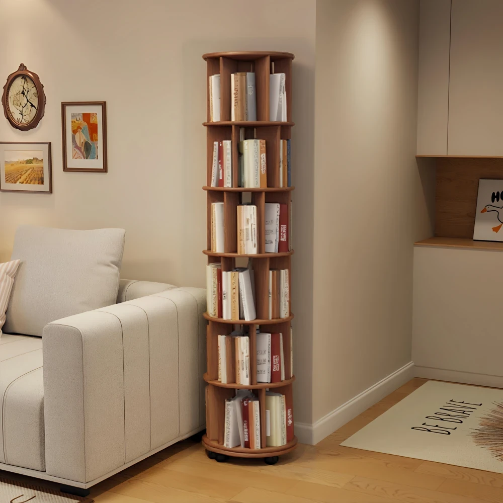 360-Degree Rotating Solid Wood Bookshelf - Mobile Sofa Side Cabinet, Circular Corner Storage Rack for Living Room, Stylish and Functional Bookcase
