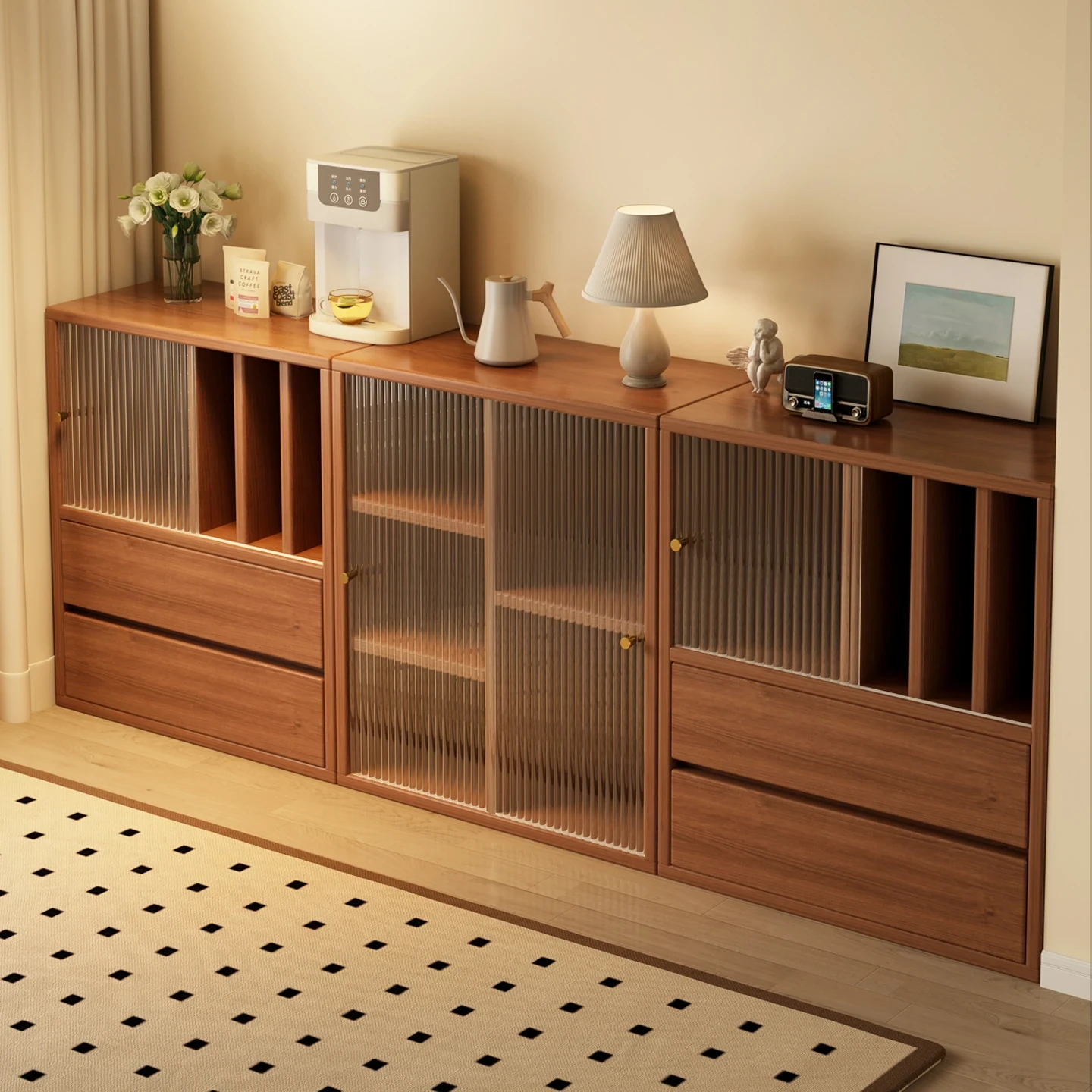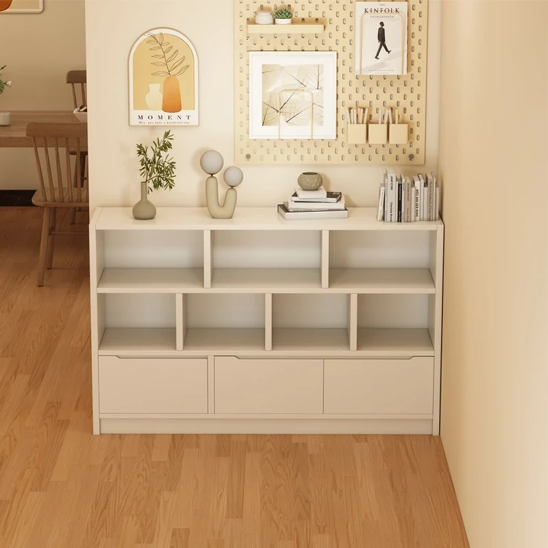 ヴィンテージ風リビング用防塵書架フロア収納ラック組み合わせ式、壁に寄せられる展示キャビネット、間仕切りサイドボード、コンパクトなローボード。スタイリッシュで機能的な収納、あなたの空間をおしゃれに演出!