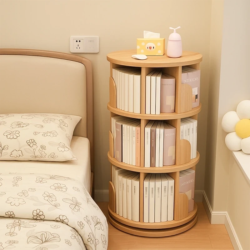 360度回転できる実木製ブックシェルフ - 寝室のベッドサイドやコーナーにぴったりな移動可能な小型絵本ラック!おしゃれで機能的な収納で、お部屋をスッキリ整頓。